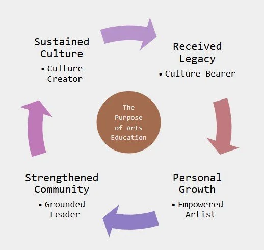 Raised in the culture of their community, a young artist receives a legacy that defines and sustains them. As they begin their artistic training, they stretch in new directions, learning the techniques and traditions of their art, while discovering their discipline's enduring understandings. They learn to trust their inner voice, fearlessly express their artistry, and fulfill a sacred responsibility to share their art in service to their communities. They become Culture Bearers.